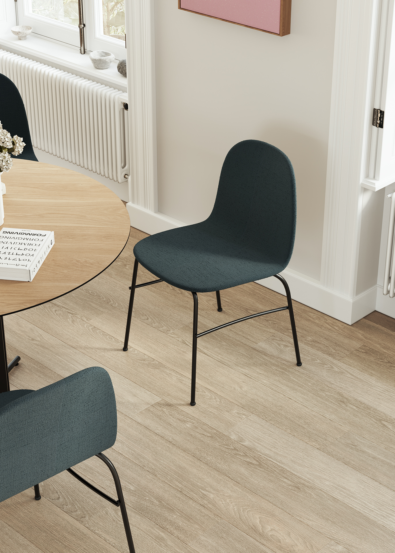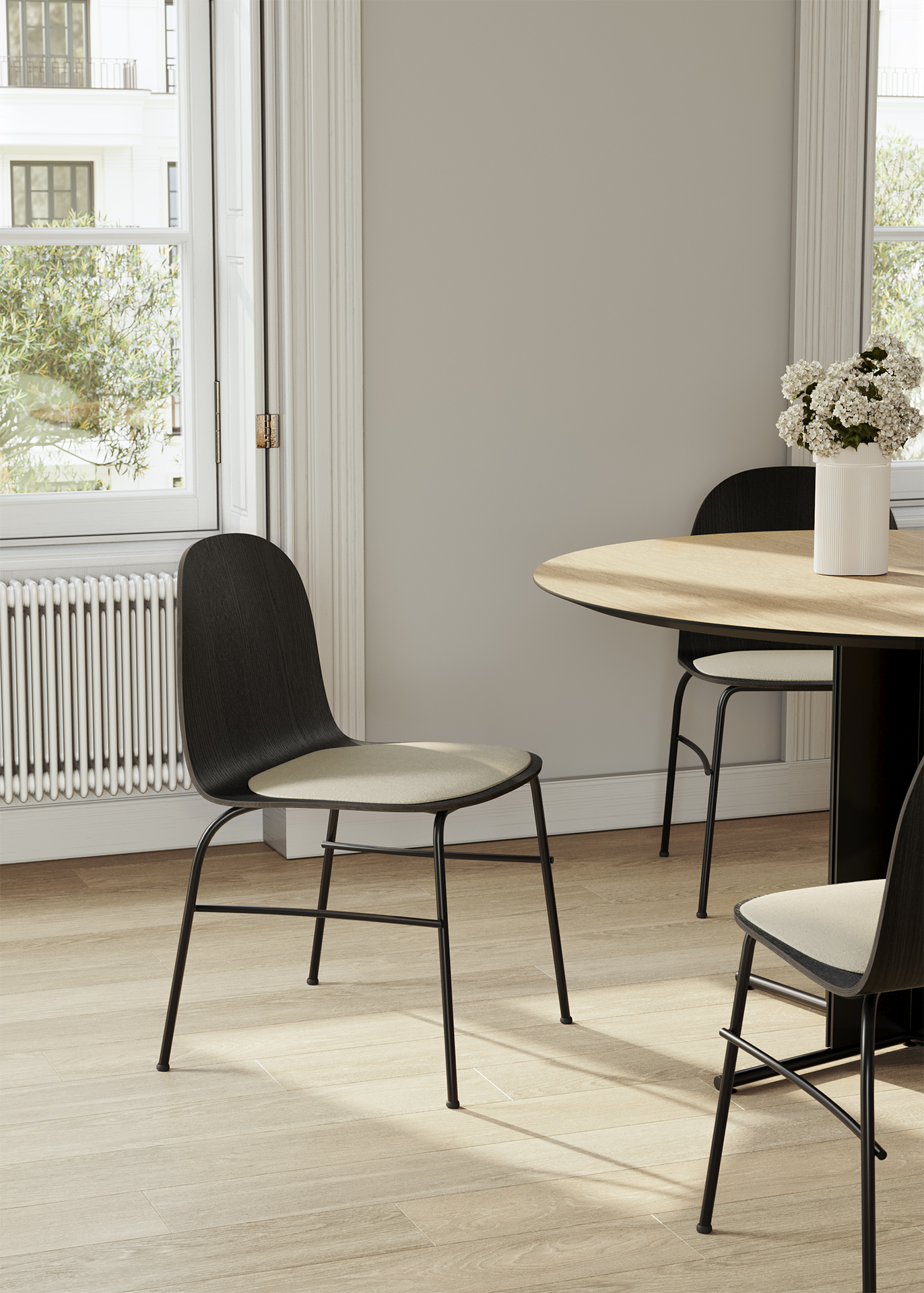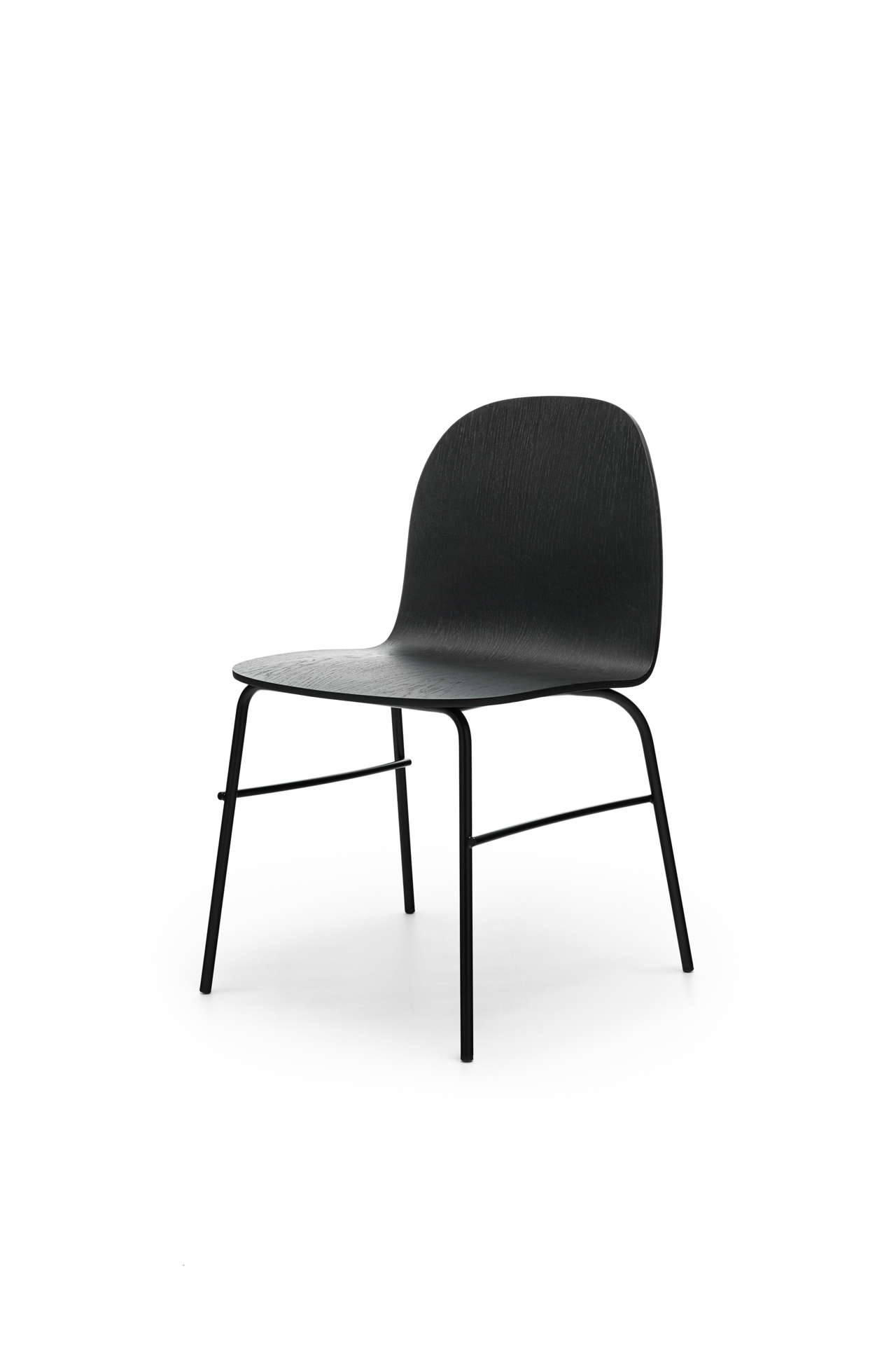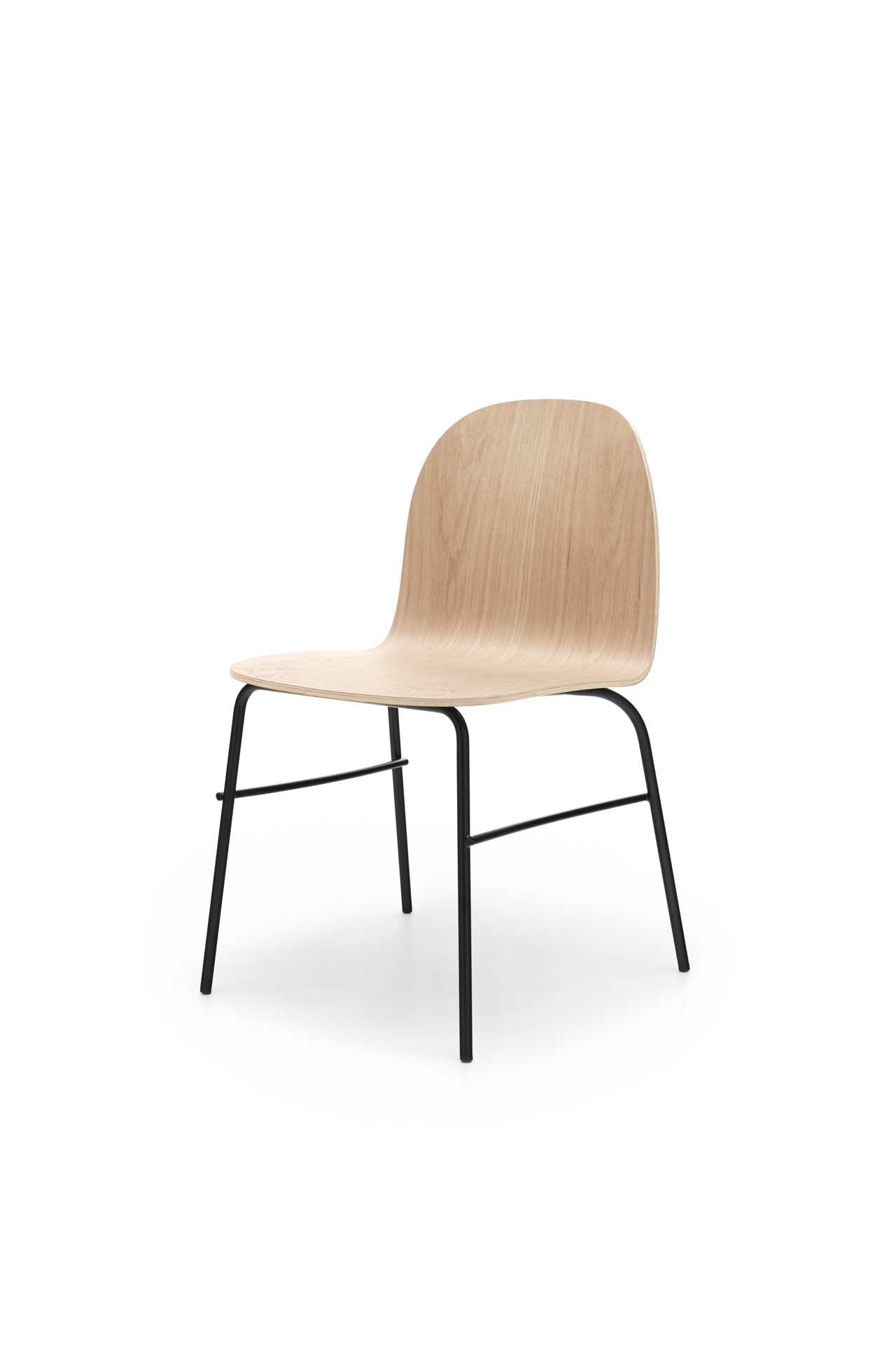 Black thermo-lacquered steel frame and plywood shell in European oak. Black plastic end caps with felt.