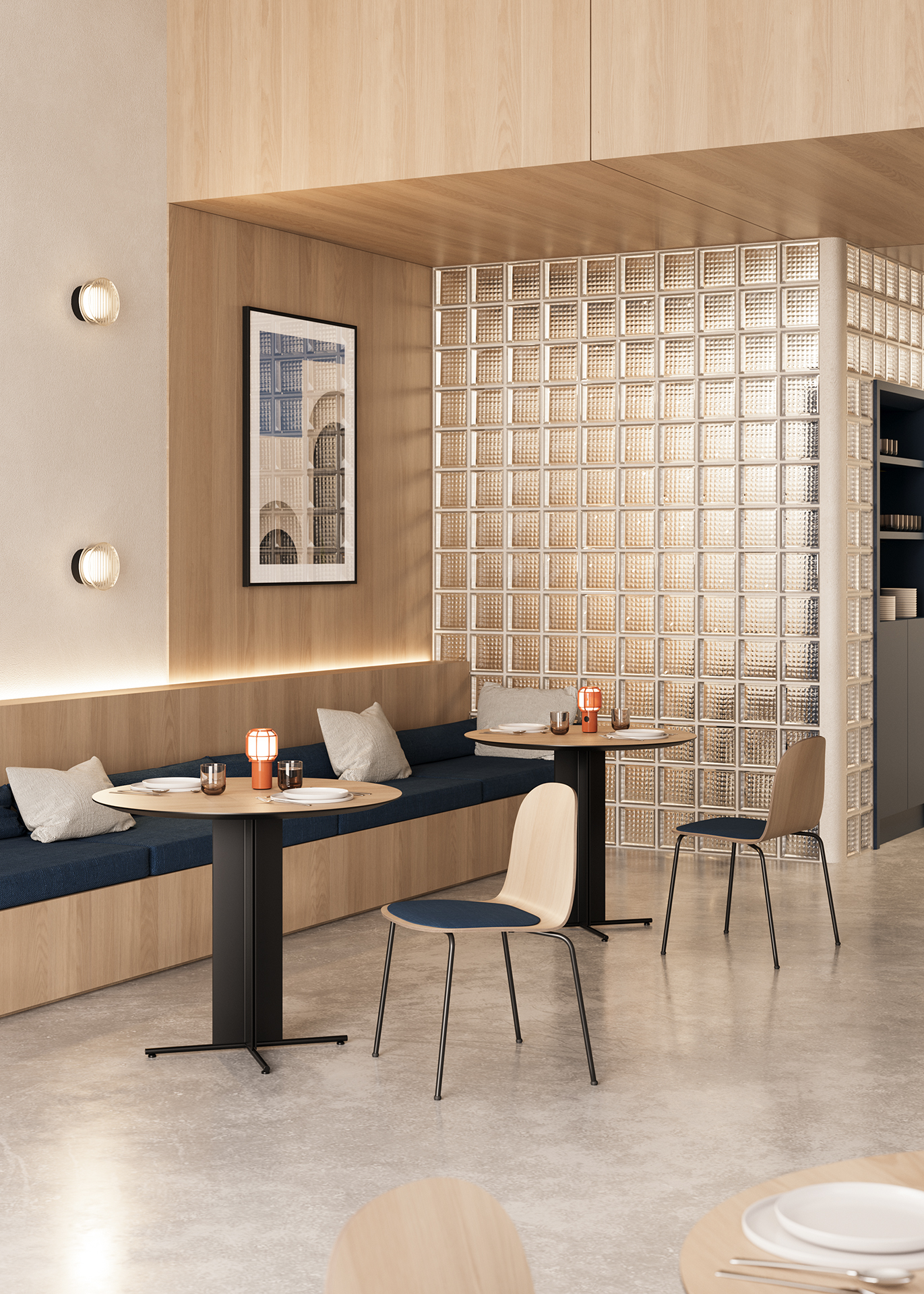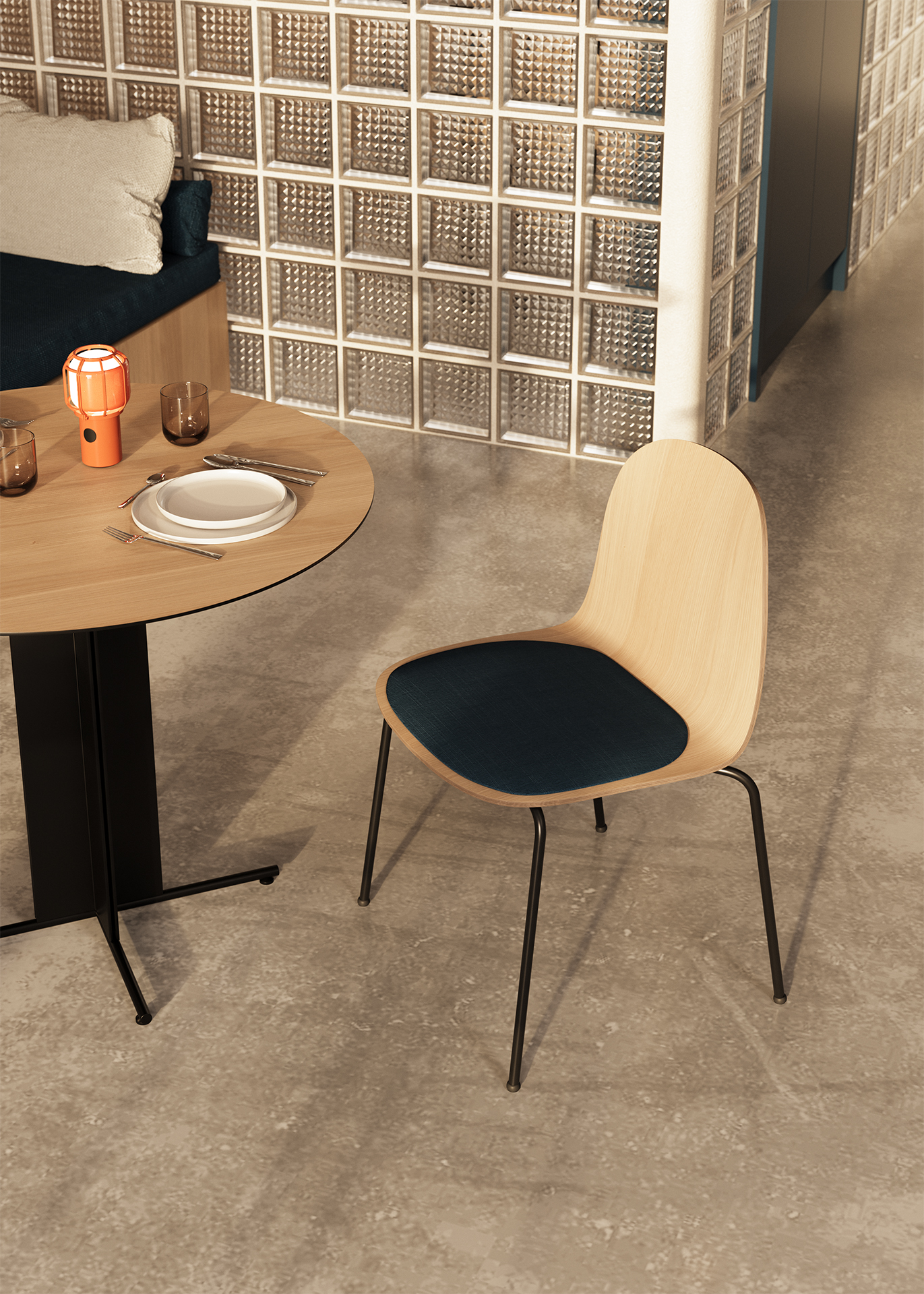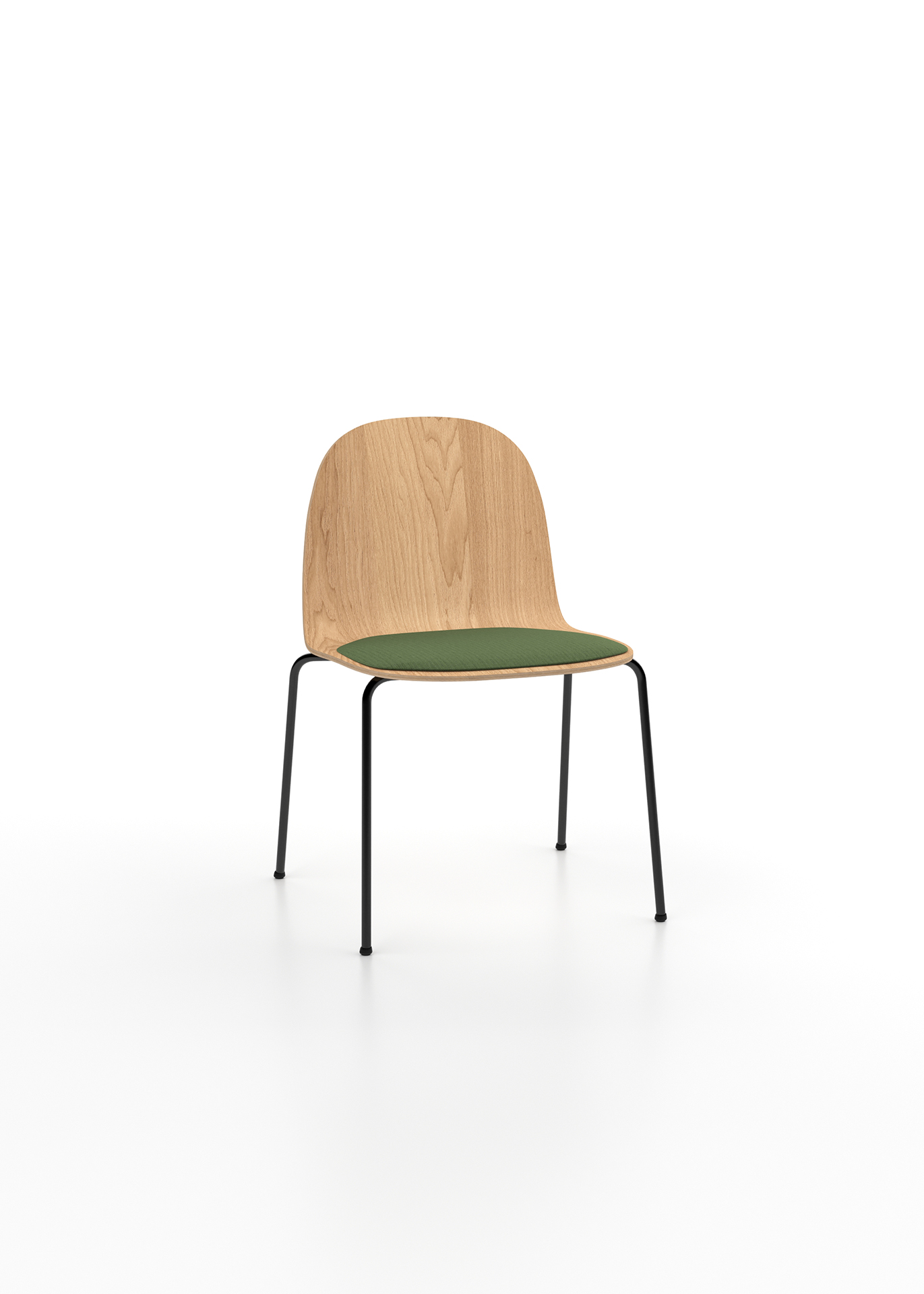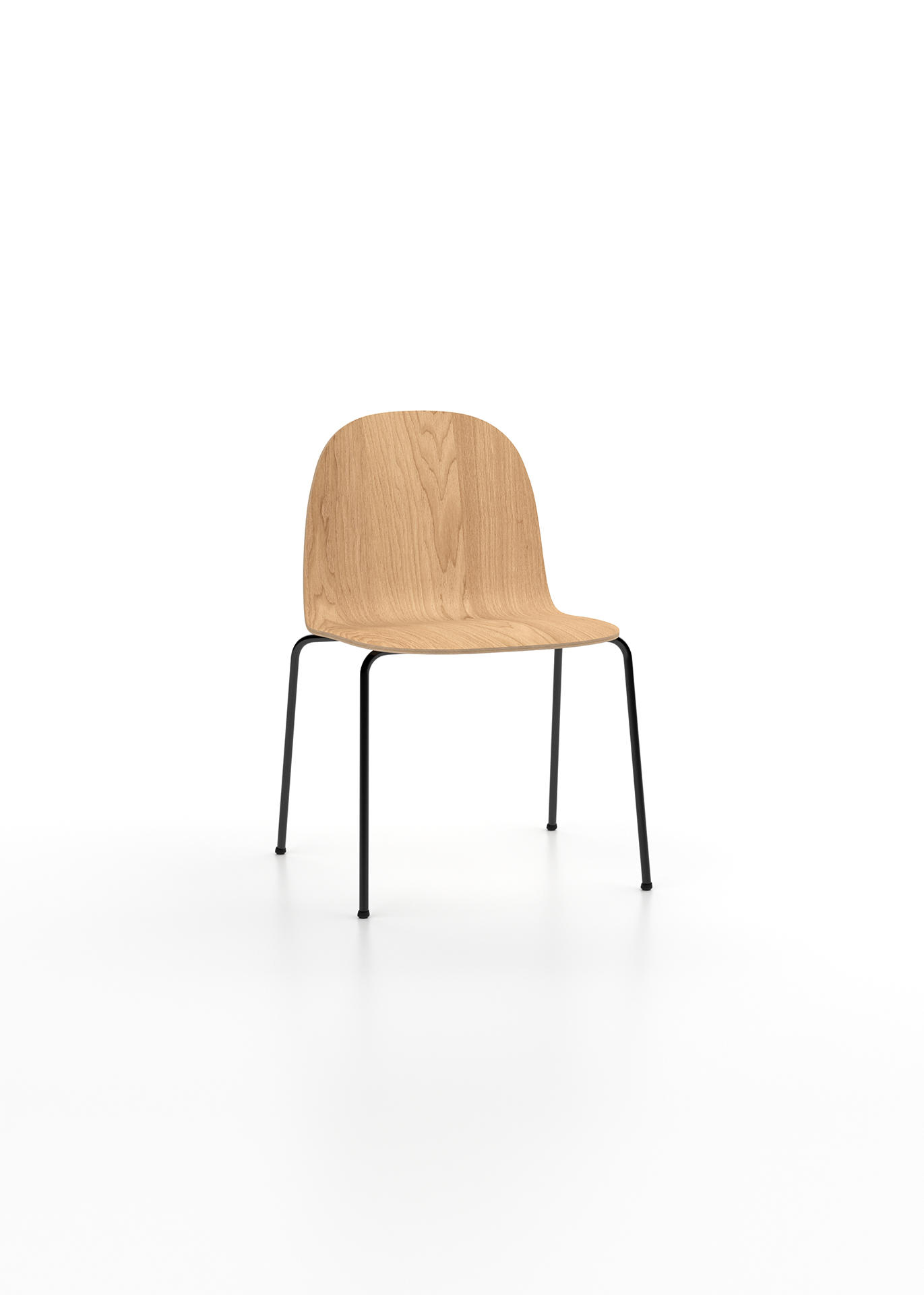 Stackable structure in black thermo-lacquered steel and plywood shell in European oak. Footprint/seat cushion covered with non-deformable CFC-free expanded polyurethane foam. Black plastic end caps with felt.