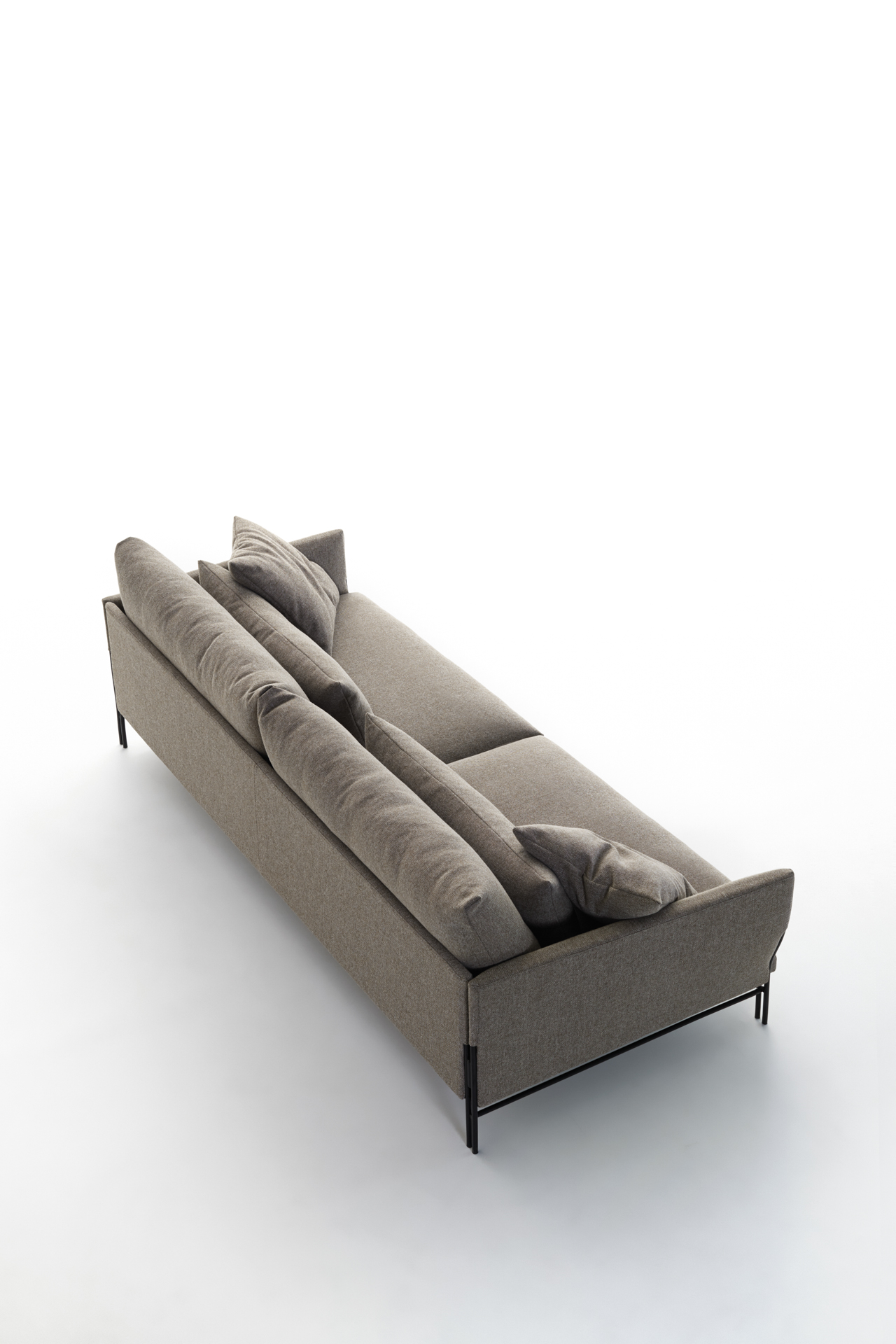 Frame made of certified solid wood, covered with high density foam. Feet and arms made of black thermo-lacquered calibrated steel. Seat suspended by elastic straps. Seat cushion made of non-deformable CFC-free expanded polyurethane foam, wrapped in a quilt filled with recycled PET microfibres. Back cushion filled with anti-dust mite goose feathers with a core of non-deformable CFC-free expanded polyurethane foam. Cushions filled with anti-dust mite goose feathers and recycled PET fibres.
