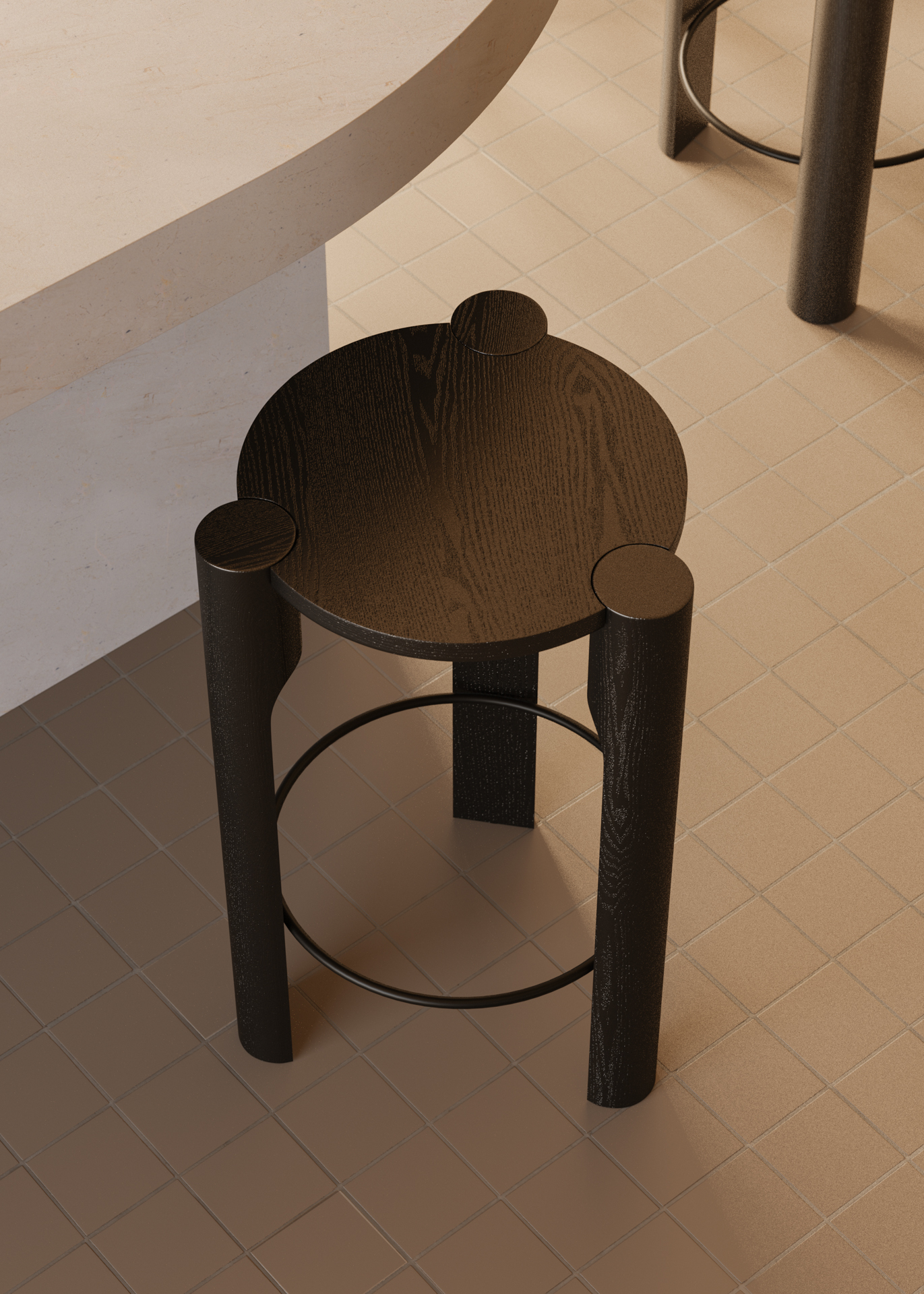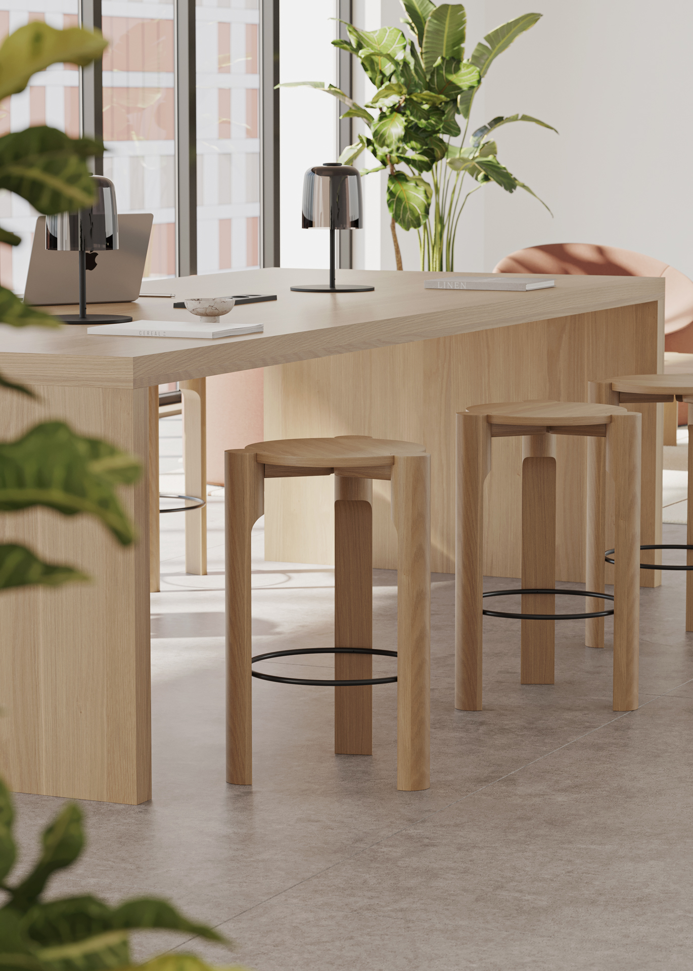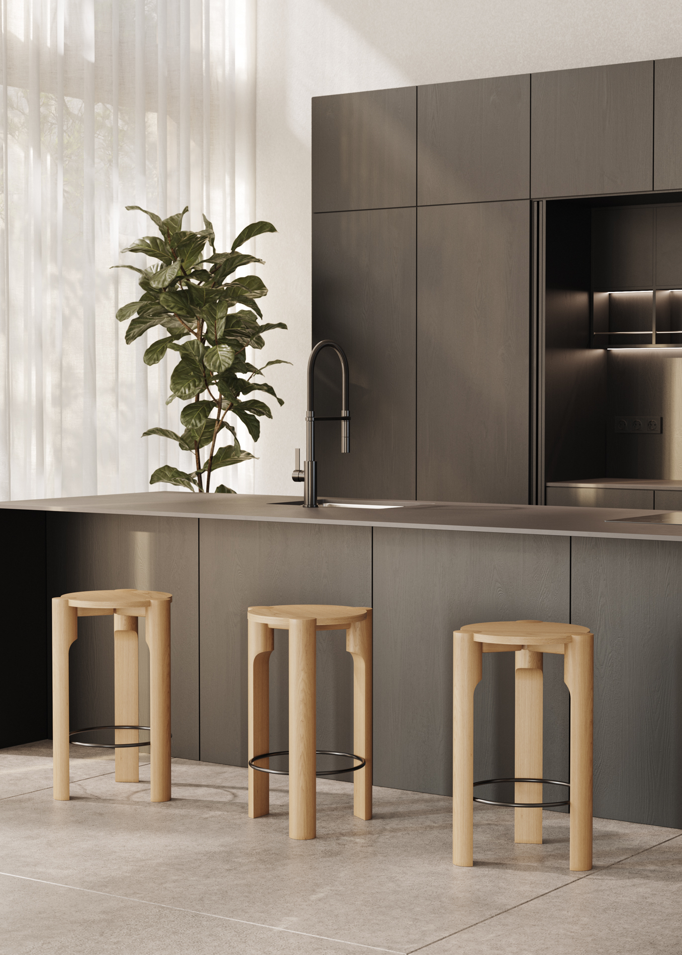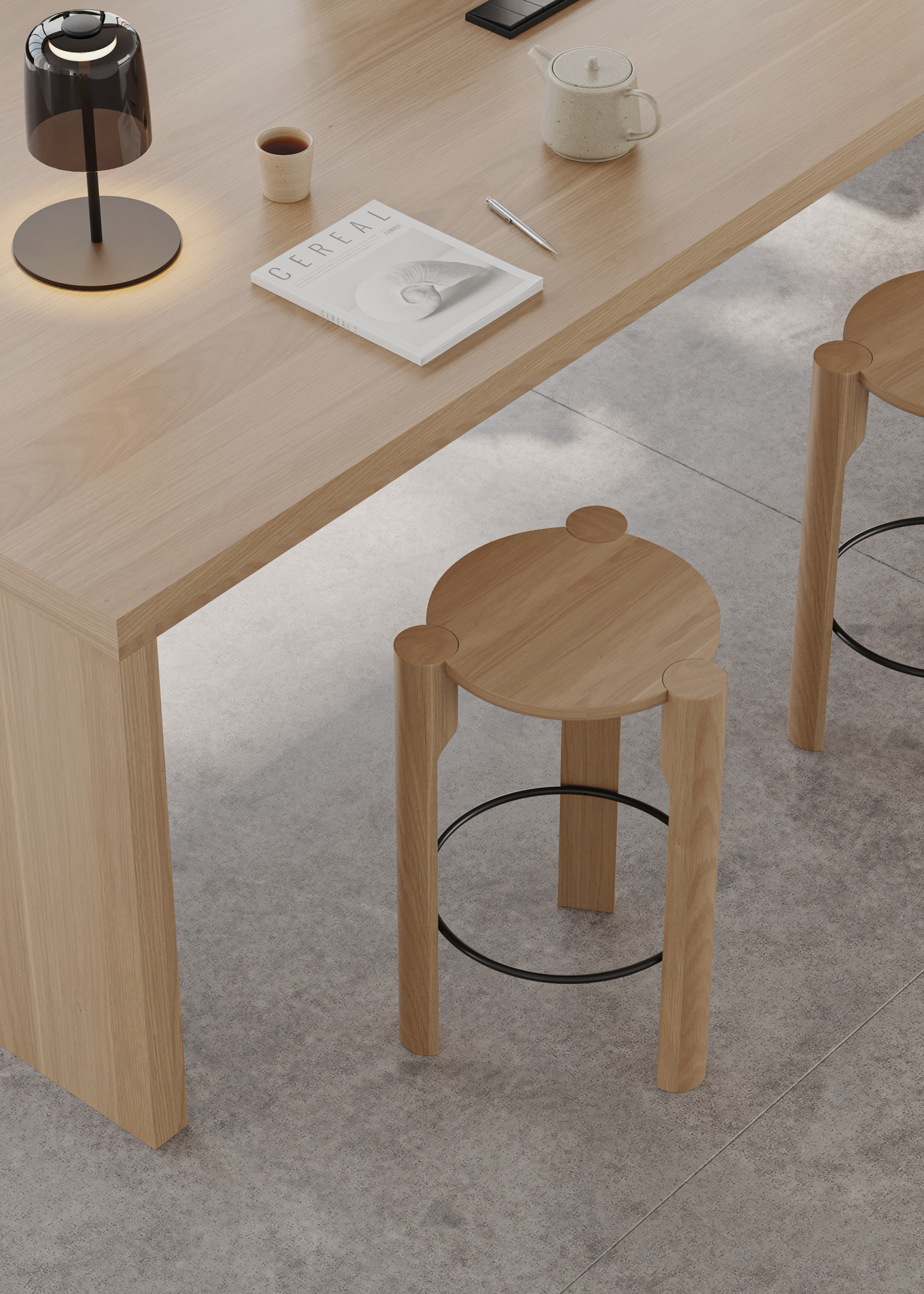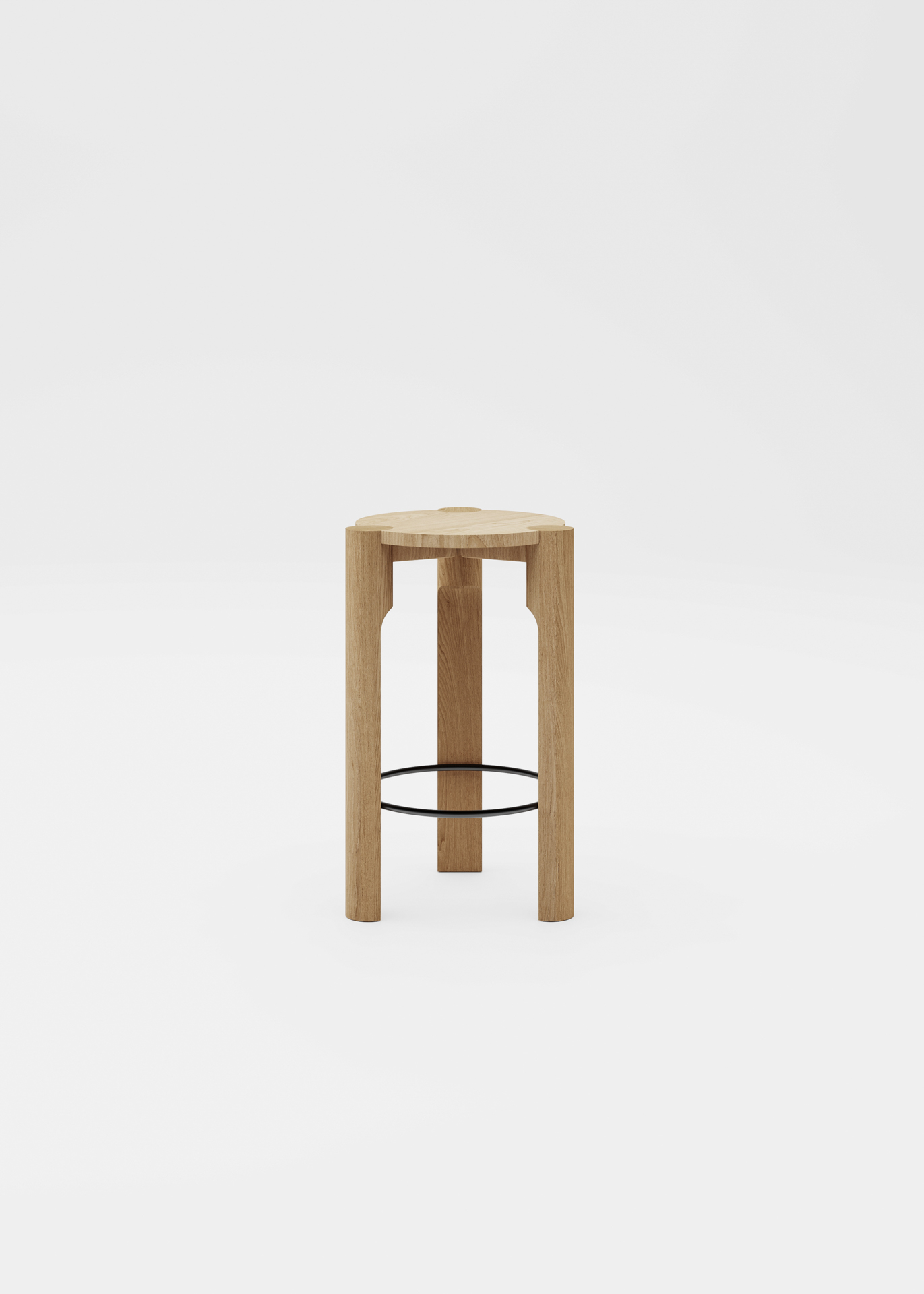 The Domus collection is based on a statement; “It is a collection that I would love to produce myself in a carpenter’s workshop, owing to its simplicity and robust form.” An exercise in simplicity, sobriety and character, defined by two details, the cut of the leg and its meeting with the top. The collection of stools in two heights, 65cm for one meter bars such as kitchen bars and 46cm height for different spaces, from home, hospitality or work.