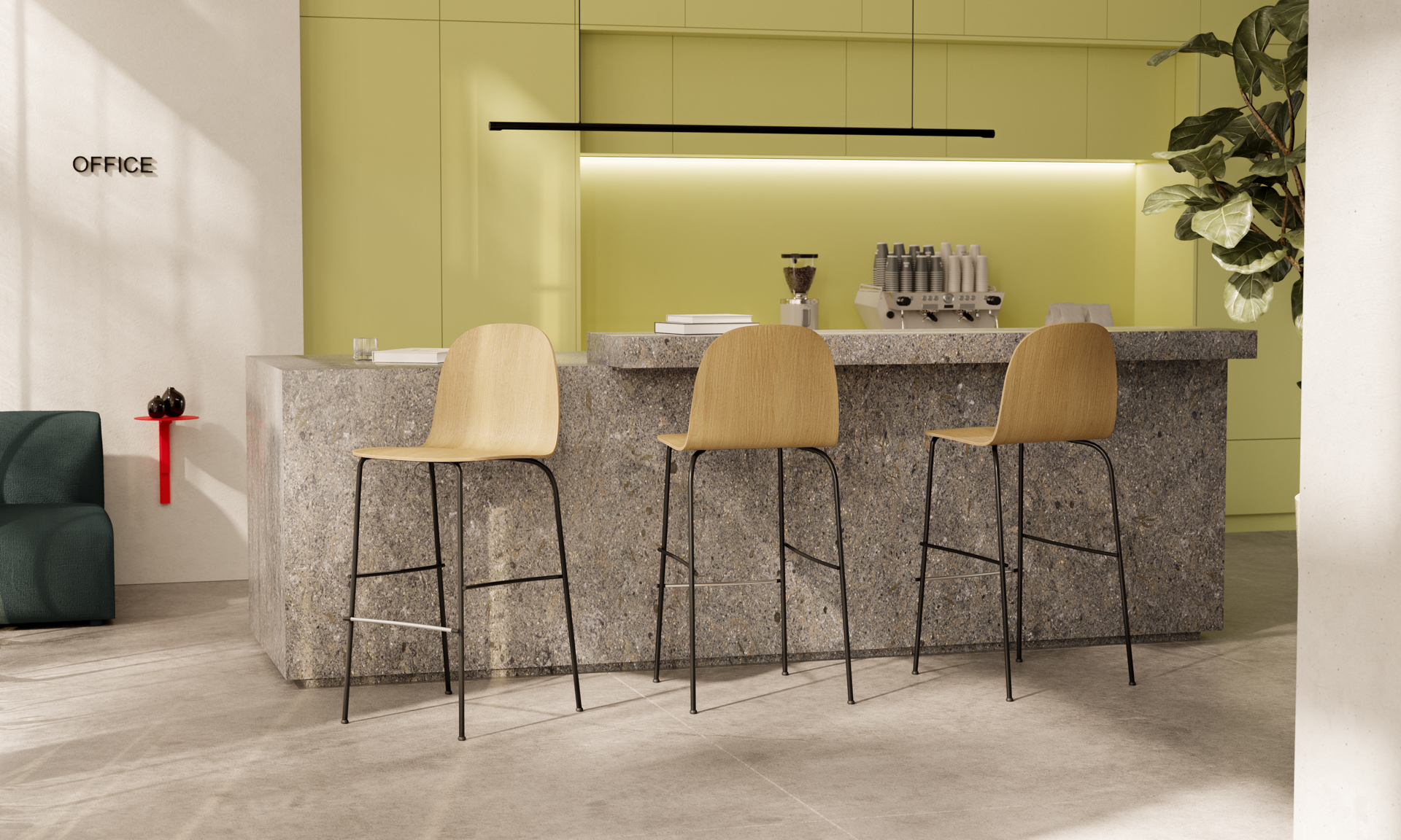 Frame in black thermo-lacquered tubular steel, seat and backrest in polished European oak plywood in different finishes. Stainless steel footrest. Black plastic mats with felt.