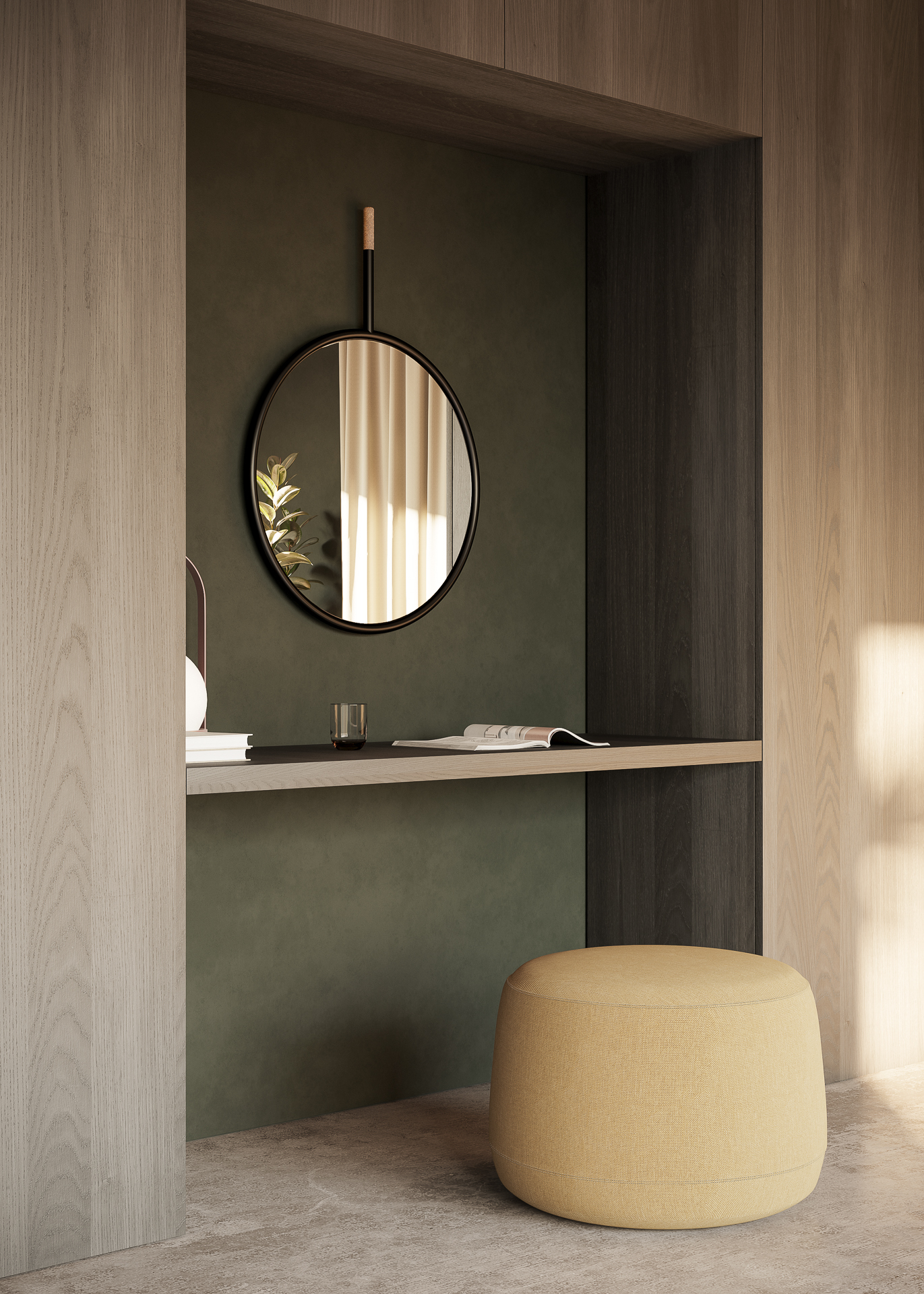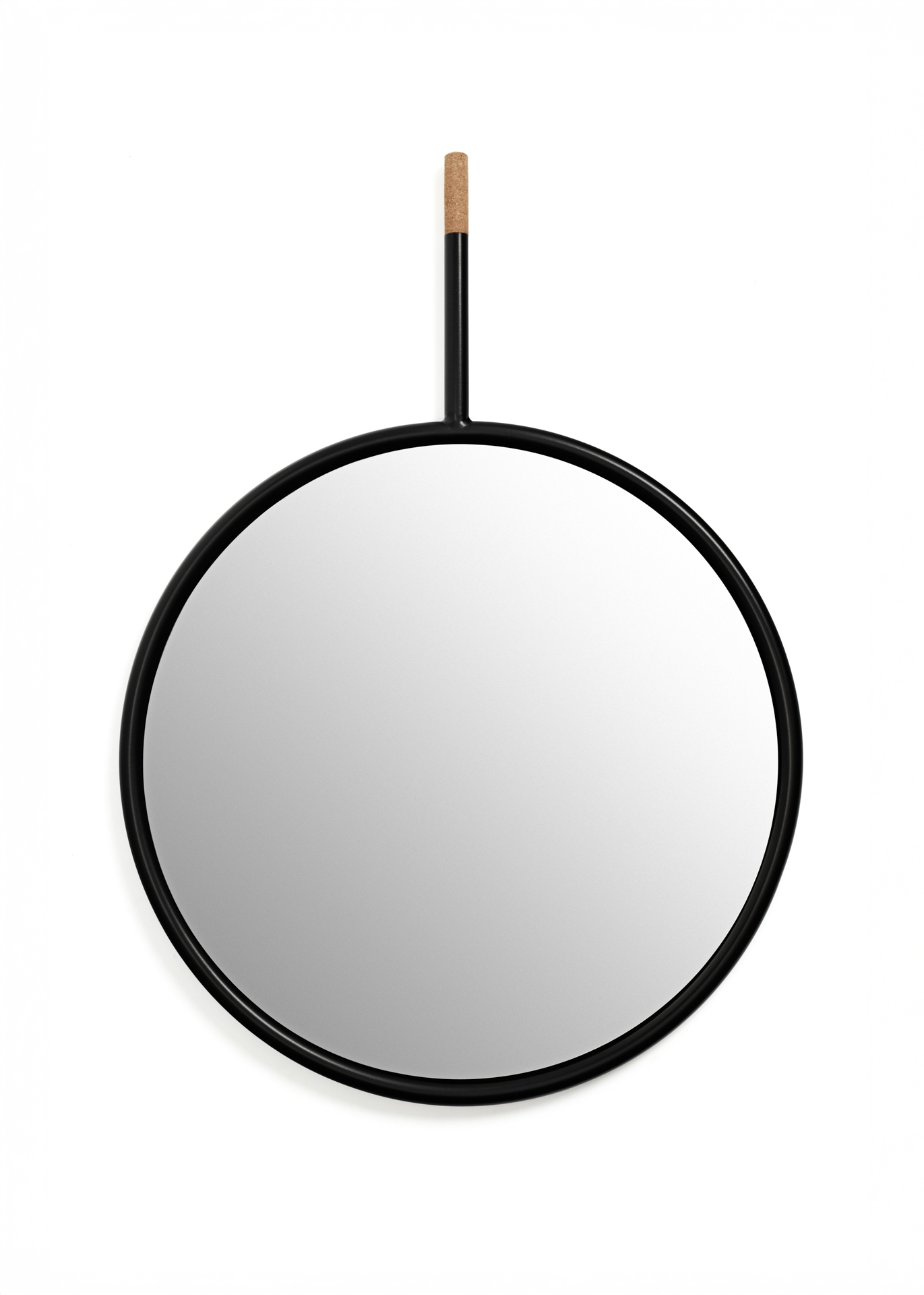 Hang Mirror es un espejo para colgar a la pared con forma geométrica circular. Nace para dar continuación y ampliar la colección de espejos de la marca. Diseño de líneas simples y contemporáneas con una estructura metálica finalizada con un detalle en corcho.