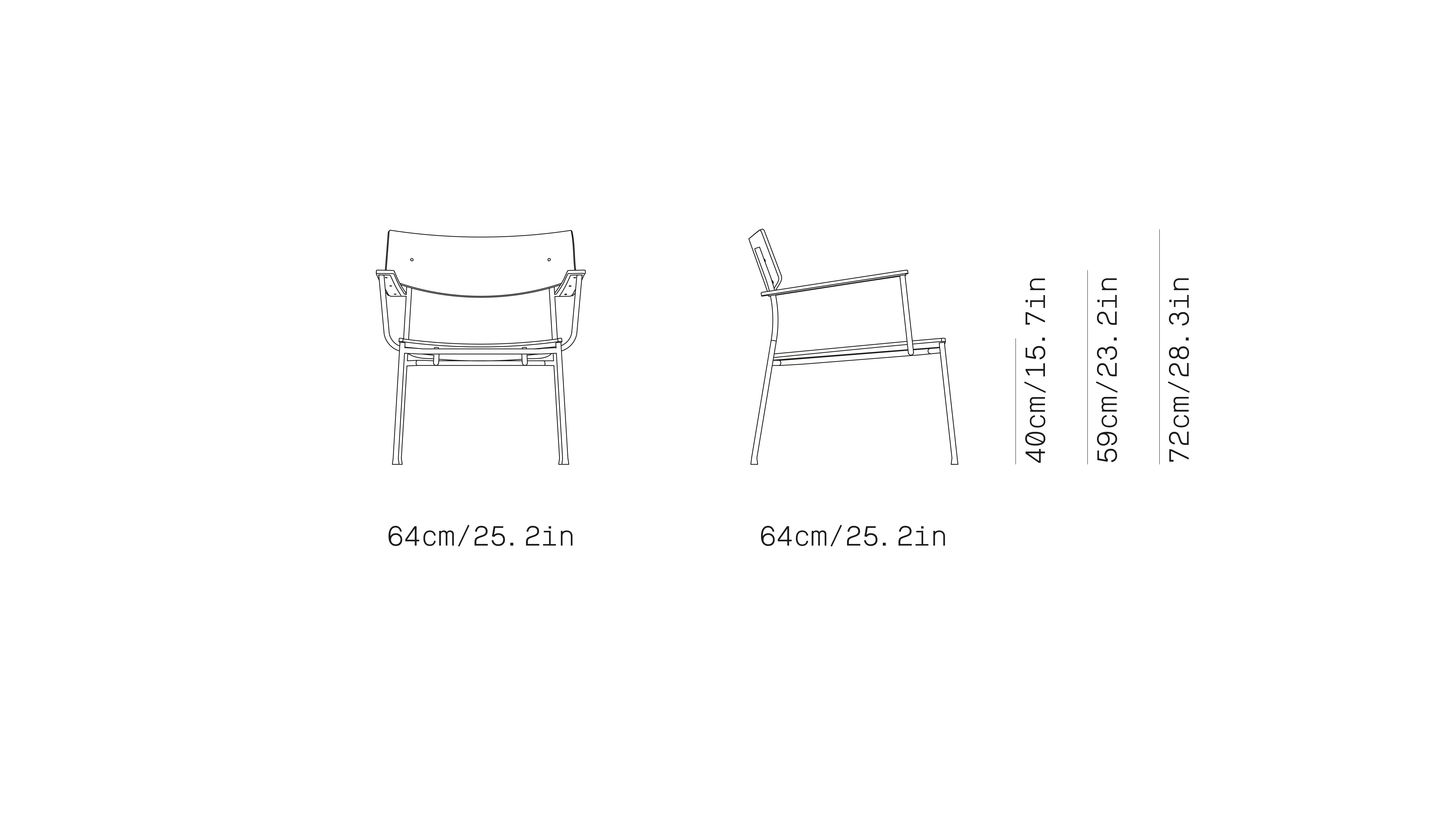 Estructura en tubo de acero termolacado en negro, asiento, respaldo y reposabrazos en contrachapado de roble europeo pulimentado en diferentes acabados. Conteras de plástico negras con fieltro.