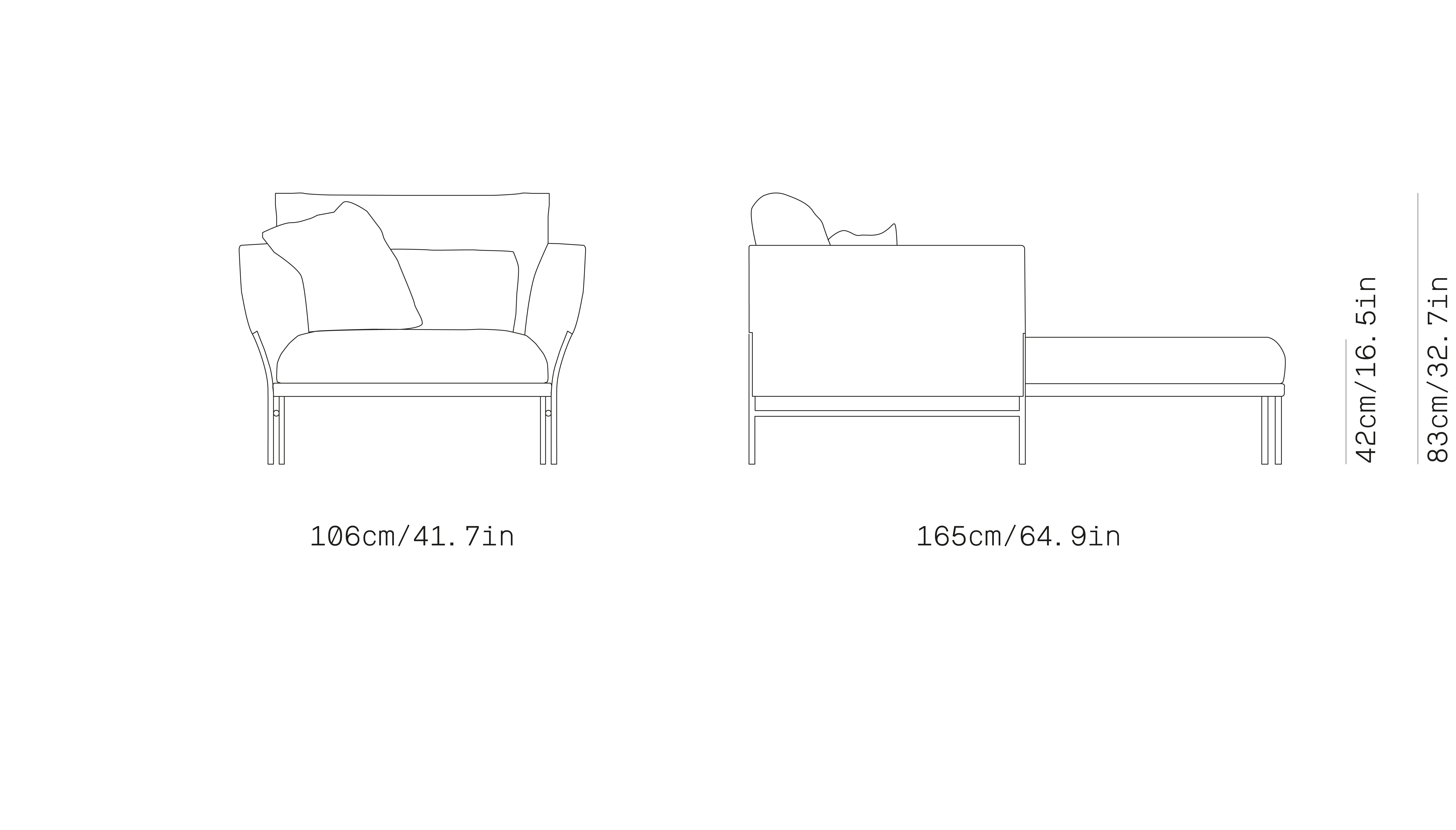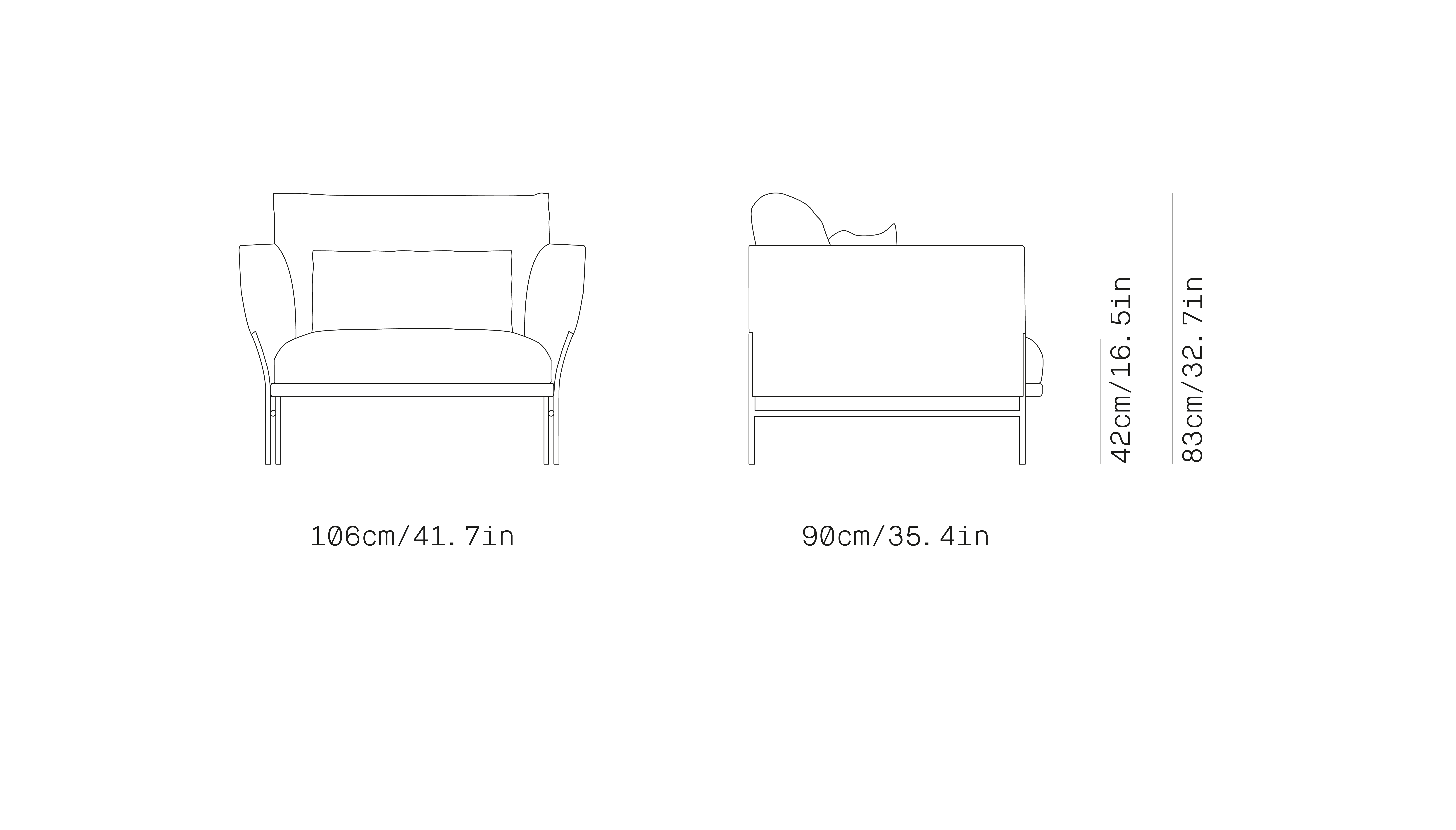 Armazón realizado en madera maciza certificada, recubierto por espuma de alta densidad. Pies y brazos realizados en acero calibrado termolacado negro. Suspensión de asiento mediante cinchas elásticas. Cojín de asiento realizado en espuma de poliuretano expandido indeformable libre de CFC, envuelto por un edredón relleno de microfibras recicladas de PET. Cojín de respaldo compuesto por plumas de oca anti ácaros con alma de espuma de poliuretano expandido indeformable libre de CFC. Cojín riñonera y auxiliar compuesto por plumas de oca anti ácaros y fibras de PET recicladas.