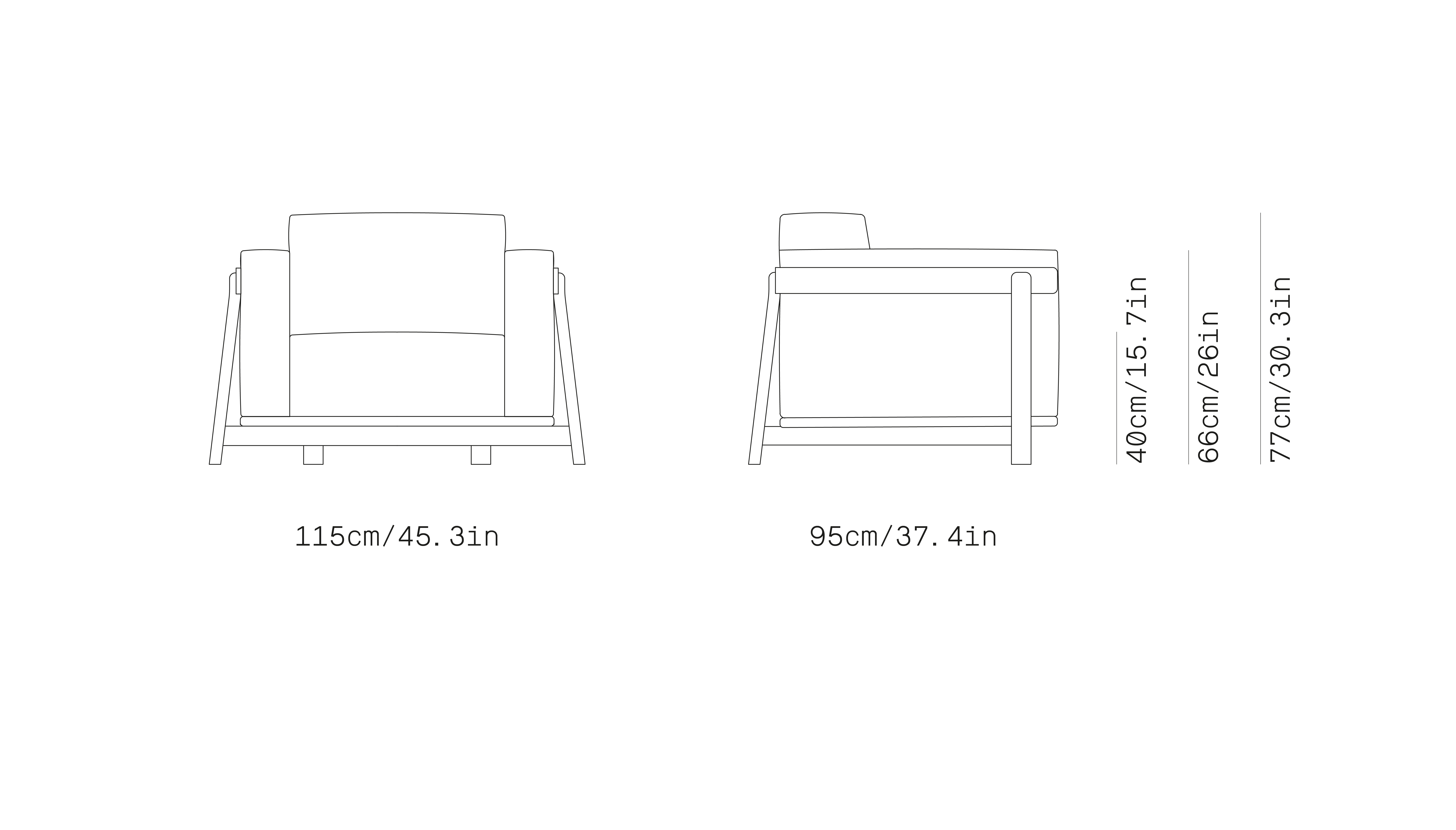 Estructura de madera maciza de haya y nogal, pulimentada en diferentes acabados. Suspensión por cinchas elásticas. Cojines de asiento, respaldo y brazos realizados en espuma de poliuretano expandido indeformable libre de CFC de diferentes densidades envueltas por un edredón relleno de fibra y pluma de oca anti ácaros. Totalmente desenfundable.