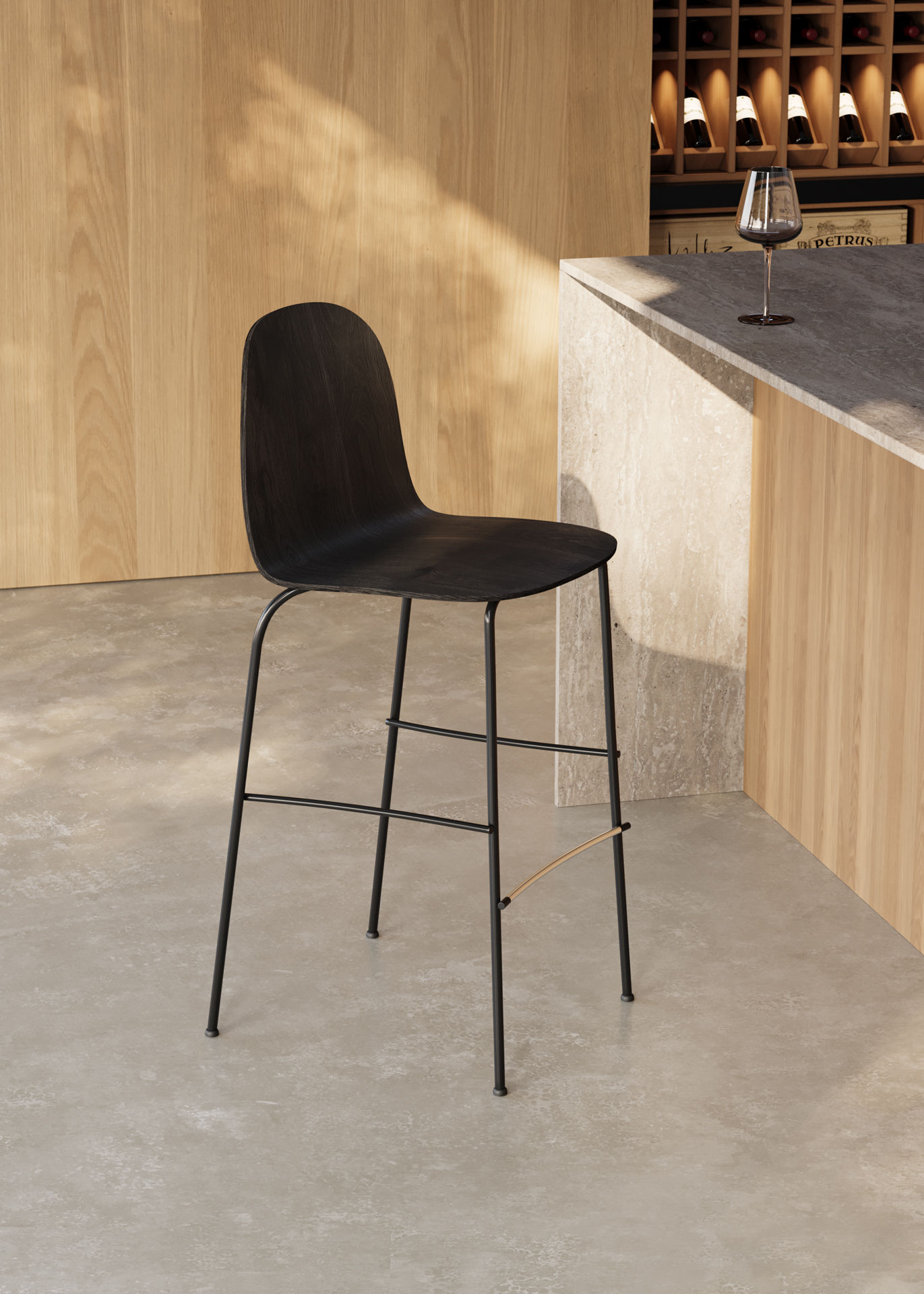 Estructura de acero termolacado en negro y carcasa de madera contrachapada en roble europeo. Reposapies en varilla de acero inoxidable. Conteras de plástico negras con fieltro.